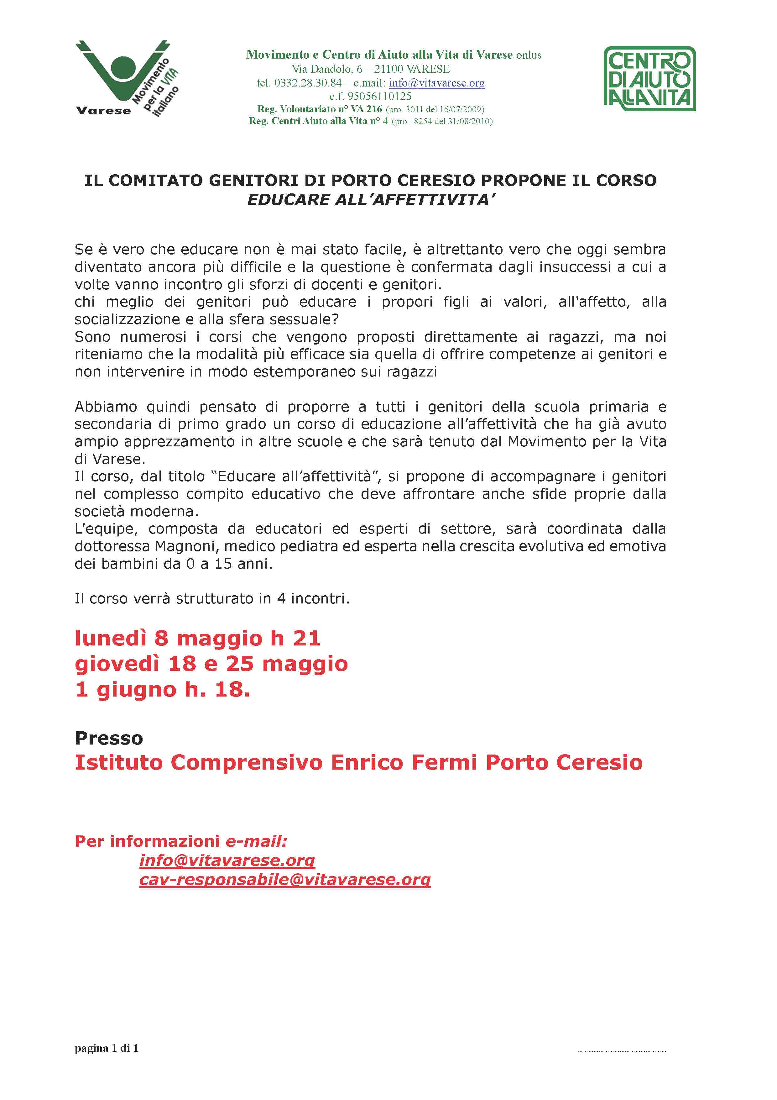 Su proposta del COMITATO GENITORI di PORTO CERESIO